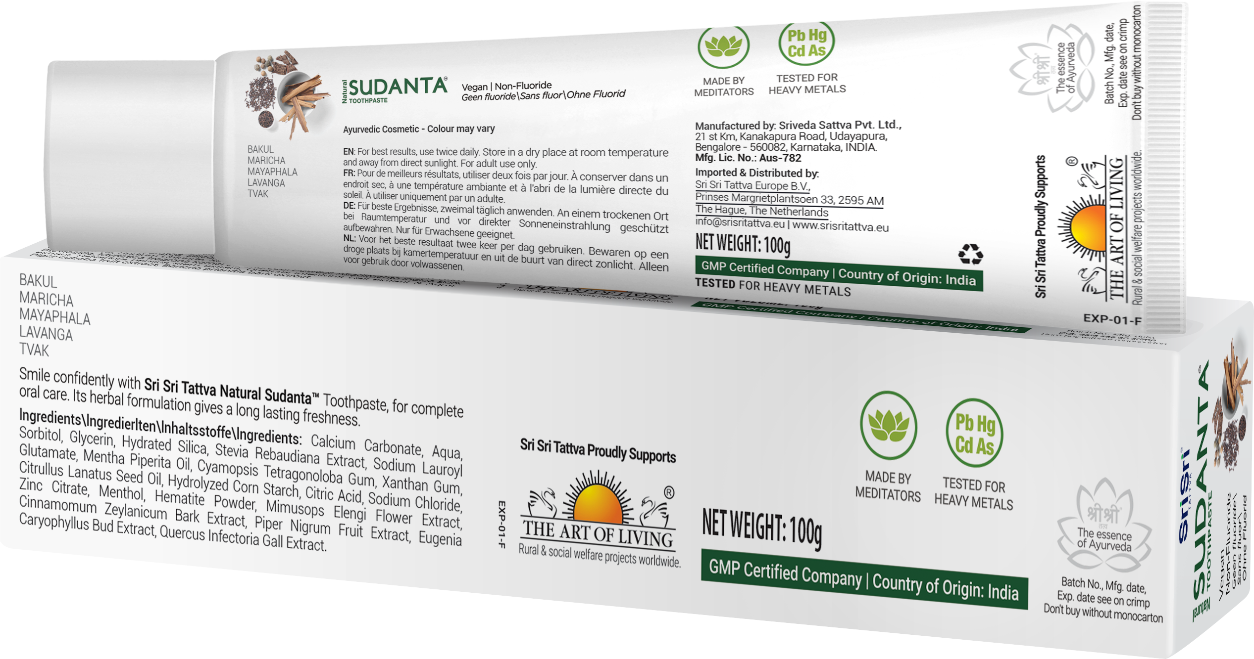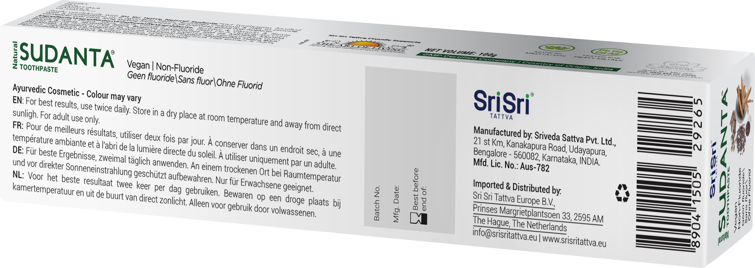 100% Natural, Vegan, Non-Fluoride, Saccharine-Free, Paraben-Free, Non-SLS, and Certified by Ecocert & COSMOS Natural — Sri Sri Tattva’s Sudanta Toothpaste delivers powerful Ayurvedic oral care with every brush.