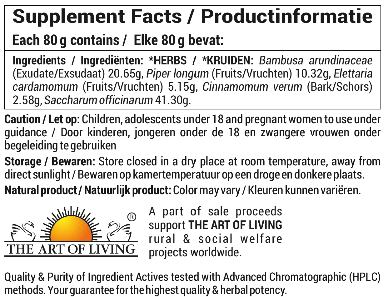 Sitopaladi Churna consists of bamboo manna (Bambousa arundinacae), pippali (known as Asian long pepper), cardamom and cinnamon. Bamboo is a delicacy in the southern part of india. Clove is known for its slightly spicy aftertaste and is known for its aroma.